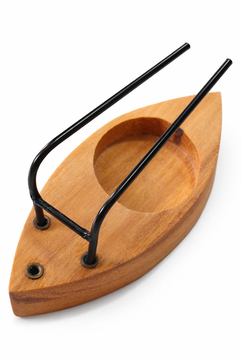 Queimador artesanal em madeira natural, com design orgânico e suporte metálico elevado para acomodar o Palo Santo com segurança. Possui cavidade central, que pode ser utilizada para colocar uma vela rechaud, auxiliando na queima contínua do Palo Santo e potencializando a liberação da fumaça aromática.